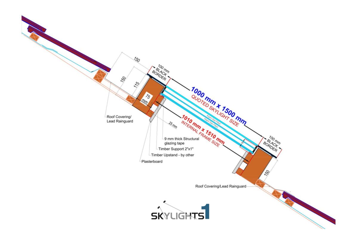 Detta högpresterande, ramfria takfönster utan öppning har tredubbelt glas med 6 mm härdat, självrengörande glas och ett U-värde på endast 0,9 W/m²K. Den angivna interna glasstorleken är 100 x 150 cm, se konstruktionsdiagrammet nedan.