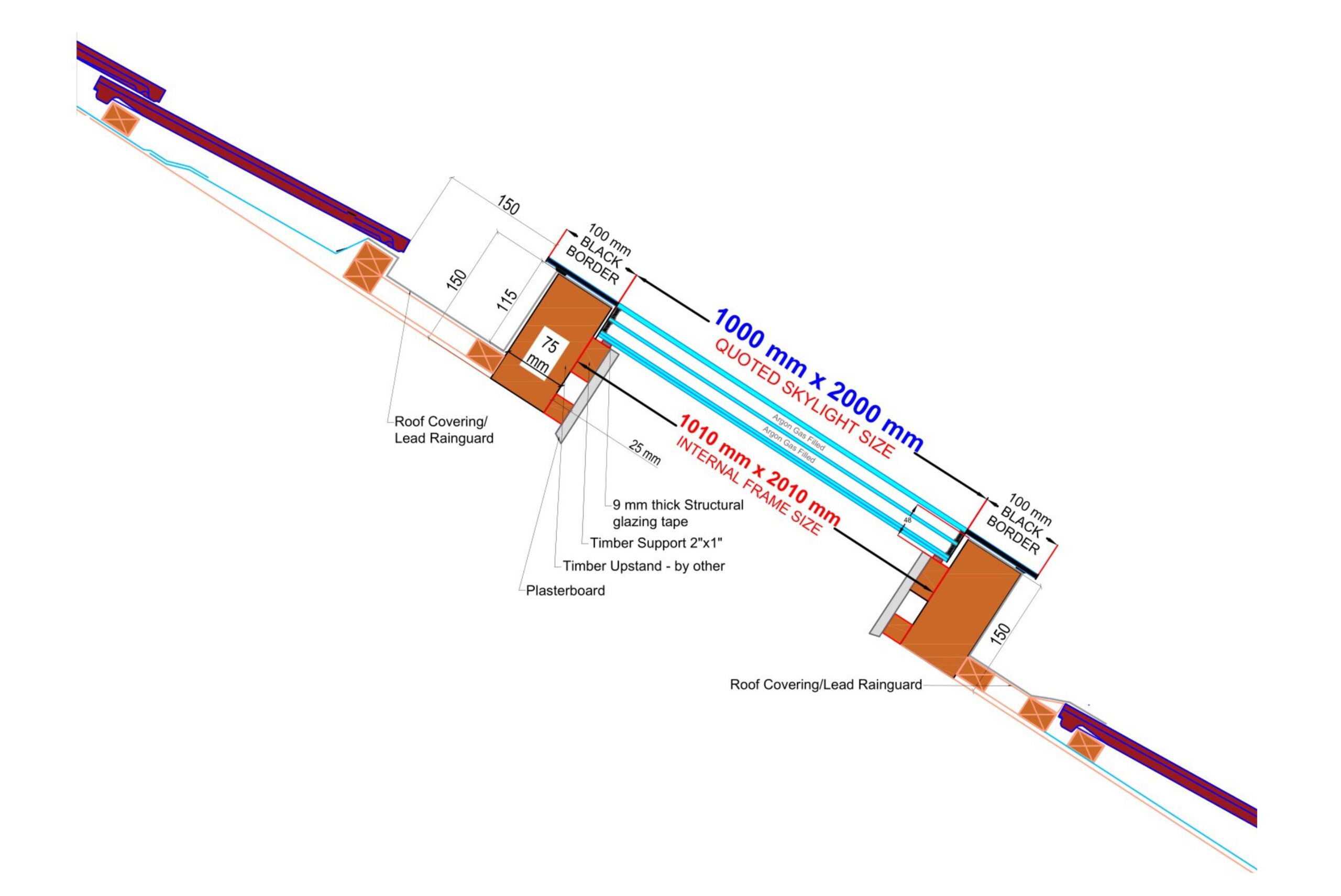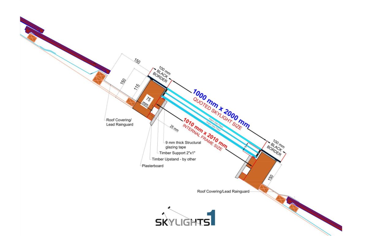 Detta högpresterande, ramfria takfönster utan öppning har tredubbla glas med 6 mm härdat, självrengörande glas och ett U-värde på endast 0,9 W/m²K. Den angivna interna glasstorleken är 1000 x 2000 mm, se konstruktionsdiagrammet nedan.