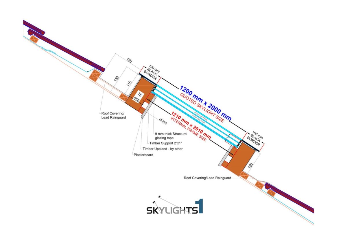 Detta högpresterande, ramfria takfönster utan öppning har tredubbelt glas med 6 mm härdat, självrengörande glas och ett U-värde på endast 0,9 W/m²K. Den angivna interna glasstorleken är 120 x 200 cm, se konstruktionsdiagrammet nedan.