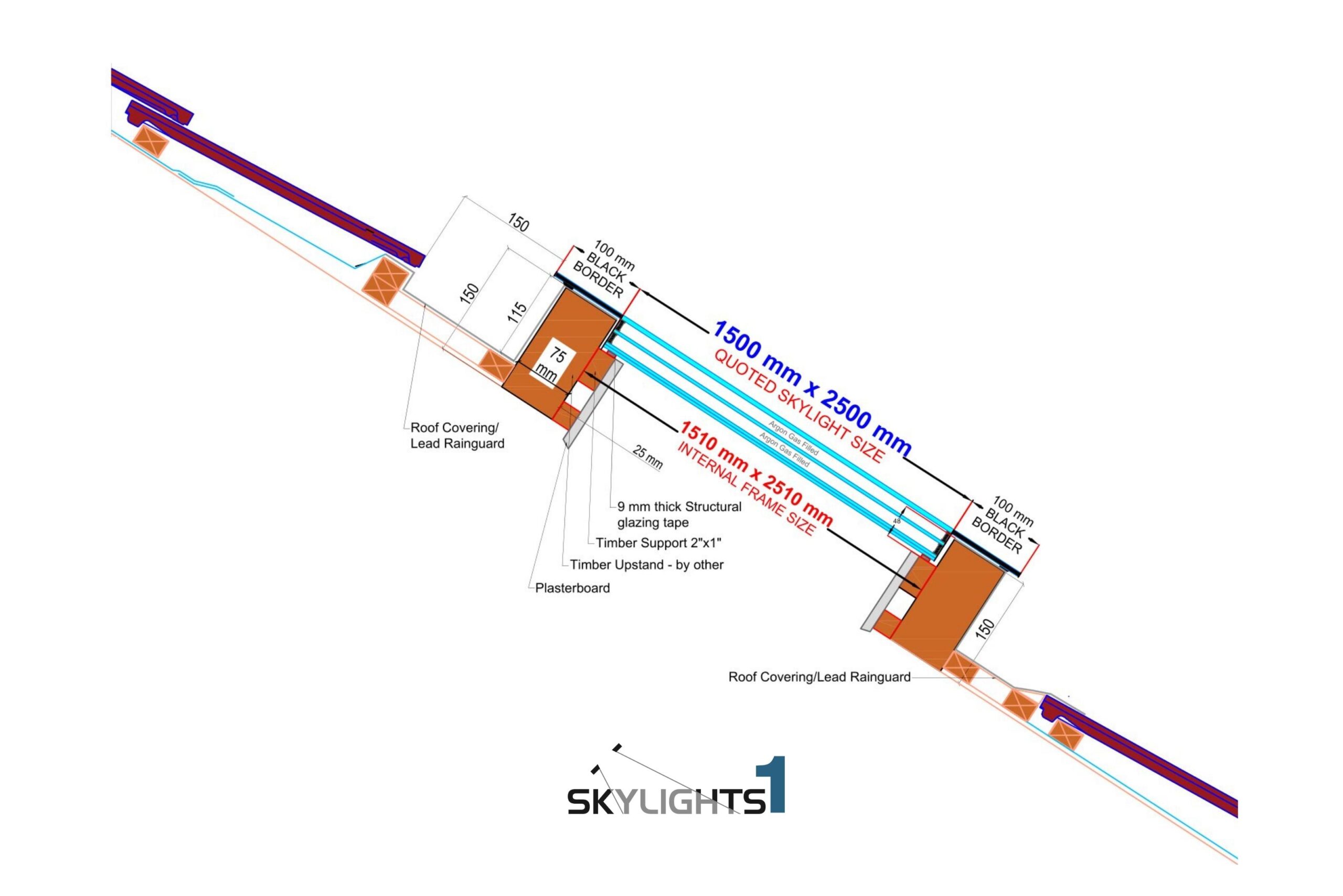 Detta högpresterande, ramfria takfönster utan öppning har tredubbelt glas med 6 mm härdat, självrengörande glas och ett U-värde på endast 0,9 W/m²K. Den angivna interna glasstorleken är 150 x 250 cm, se konstruktionsdiagrammet nedan.