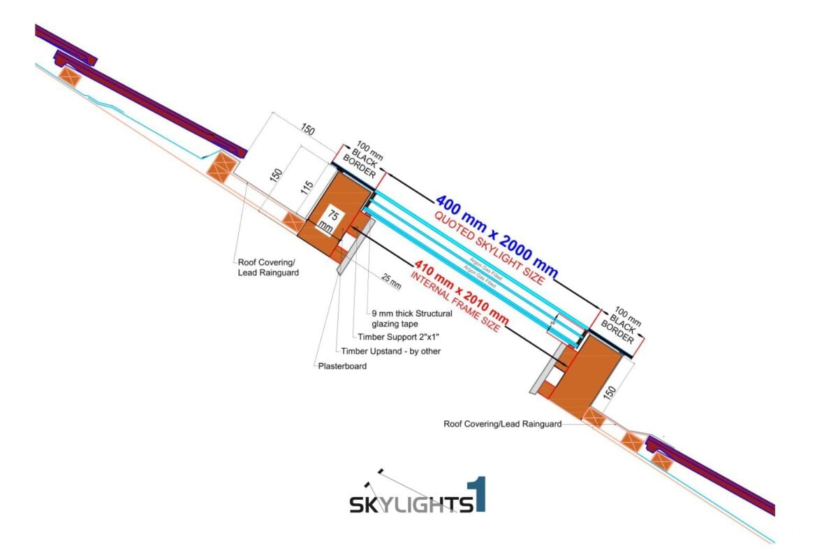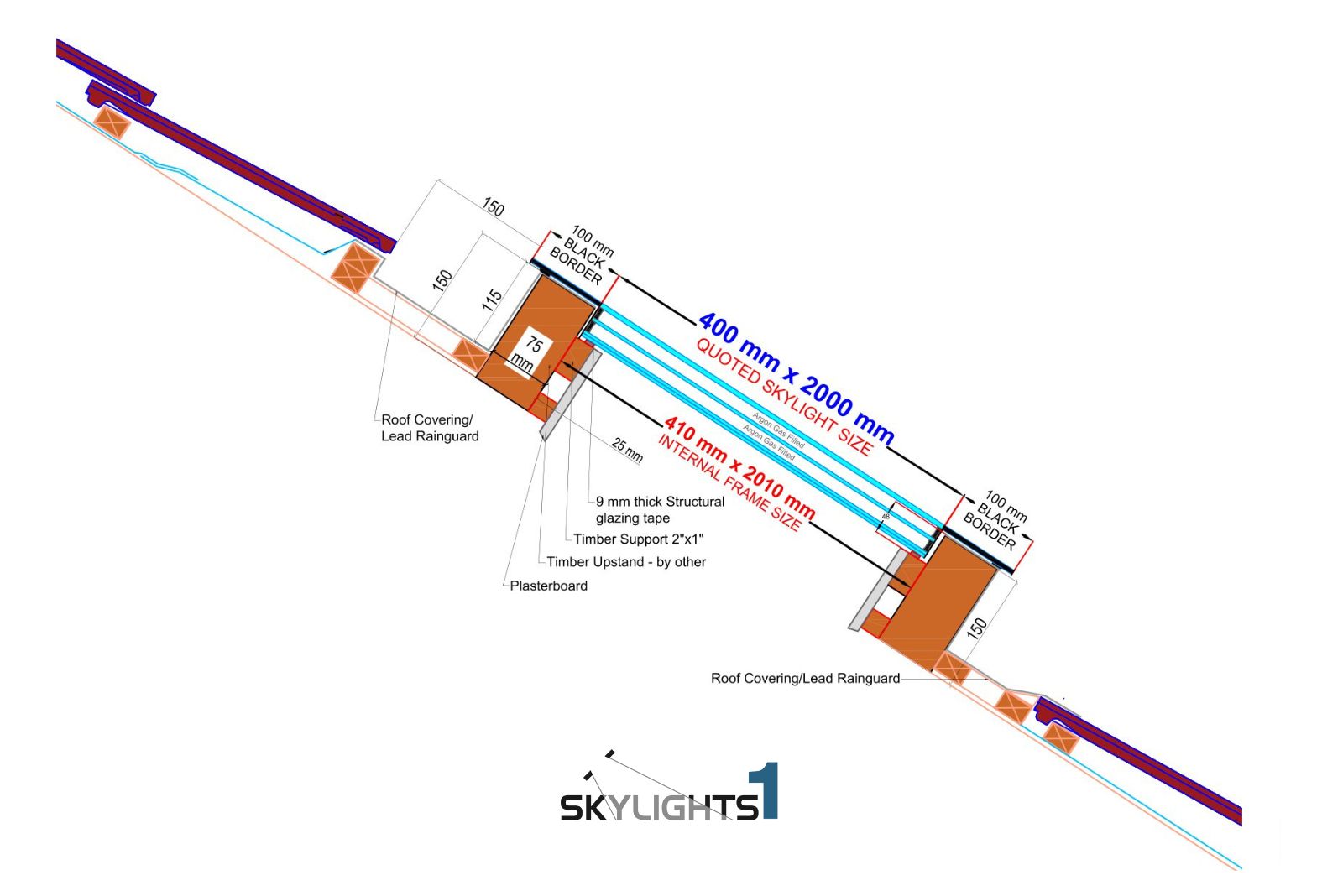 Detta högpresterande, ramlösa takfönster utan öppning har tredubbla glas med 6 mm härdat, självrengörande glas och ett U-värde på endast 0,9 W/m²K. Den angivna interna glasstorleken är 40 x 200 cm, se konstruktionsdiagrammet nedan.