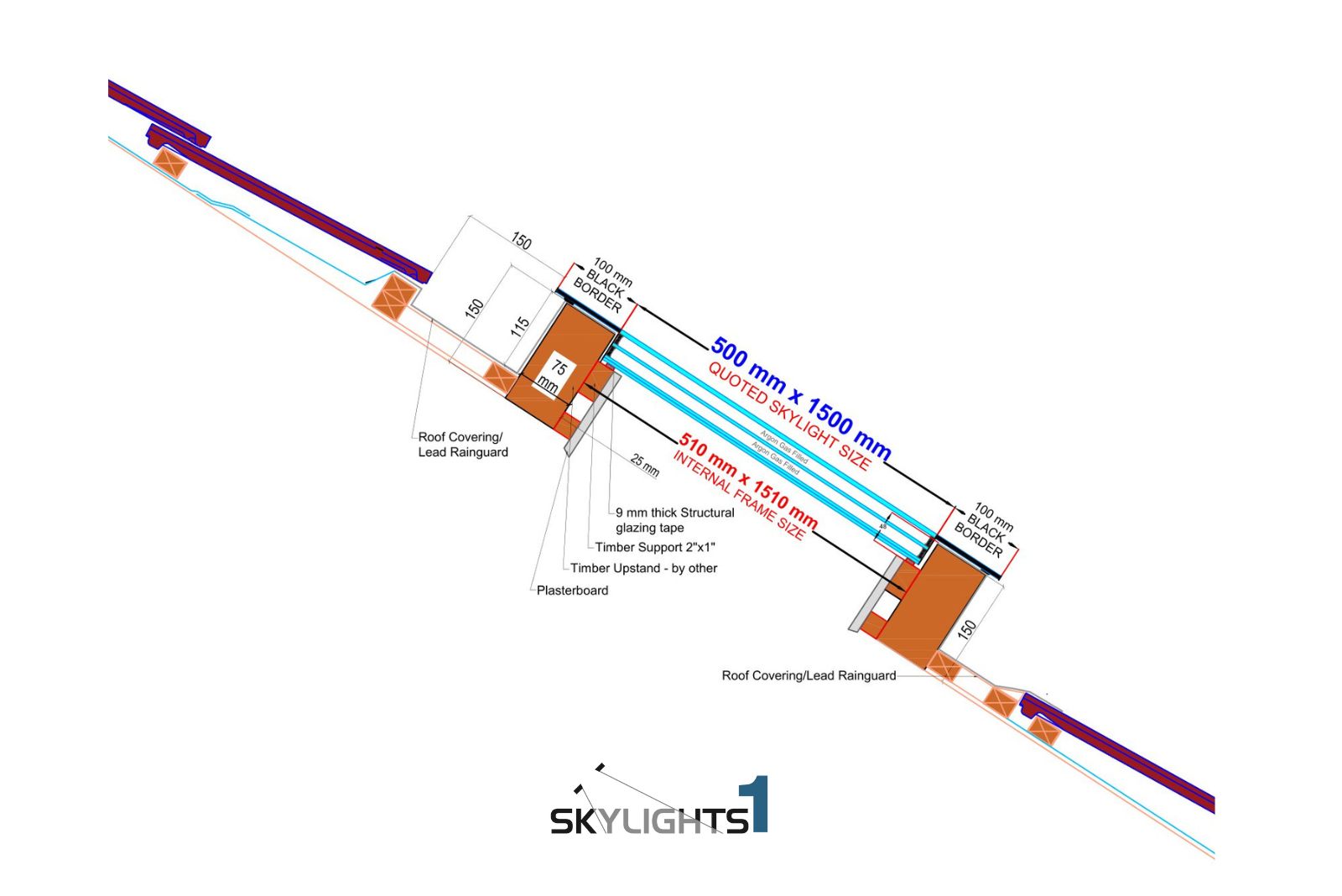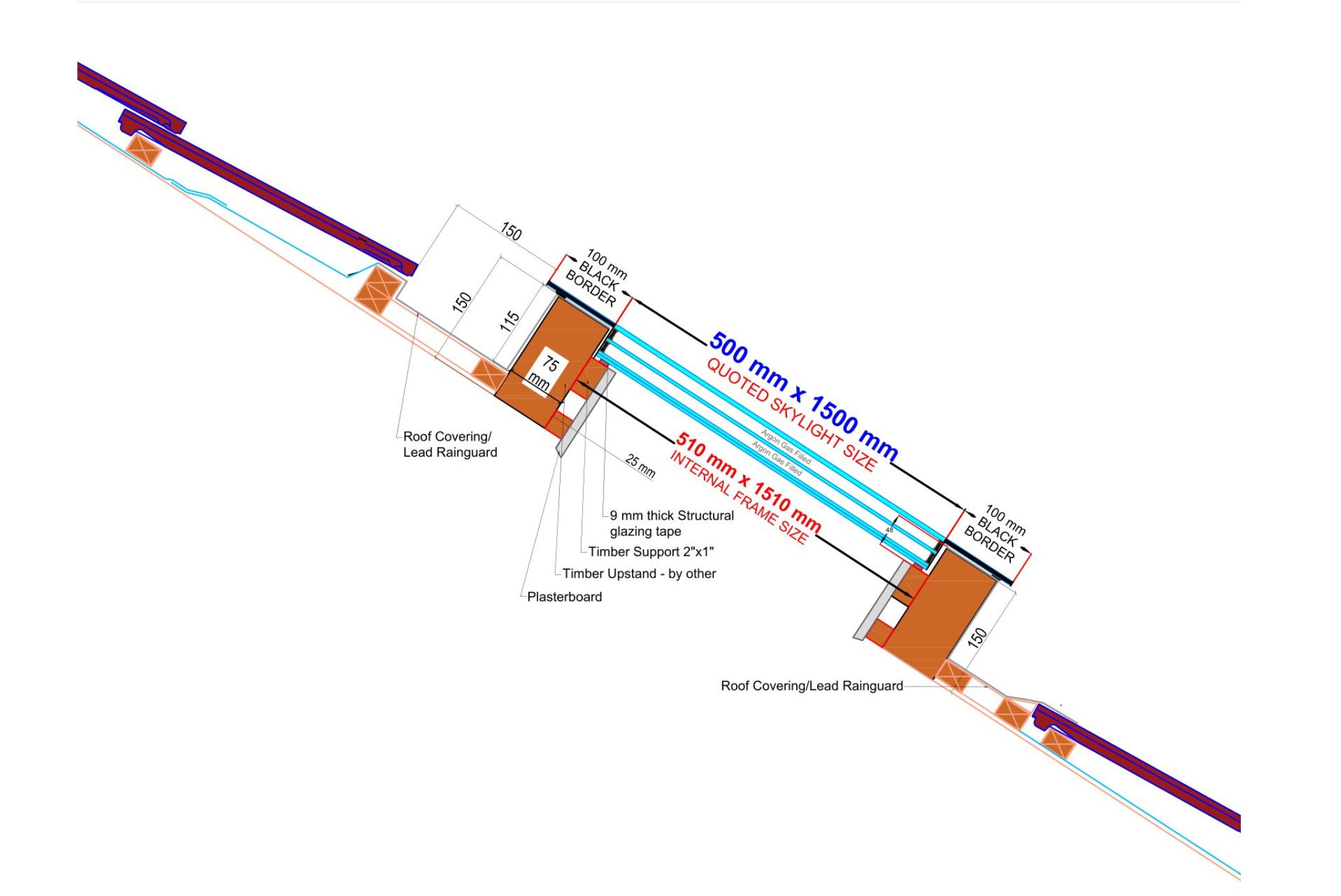 Detta högpresterande, ramfria takfönster utan öppning har tredubbelt glas med 6 mm härdat, självrengörande glas och ett U-värde på endast 0,9 W/m²K. Den angivna interna glasstorleken är 50 x 150 cm, se konstruktionsdiagrammet nedan.