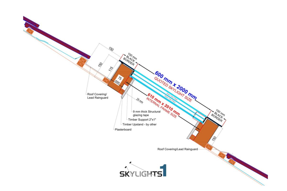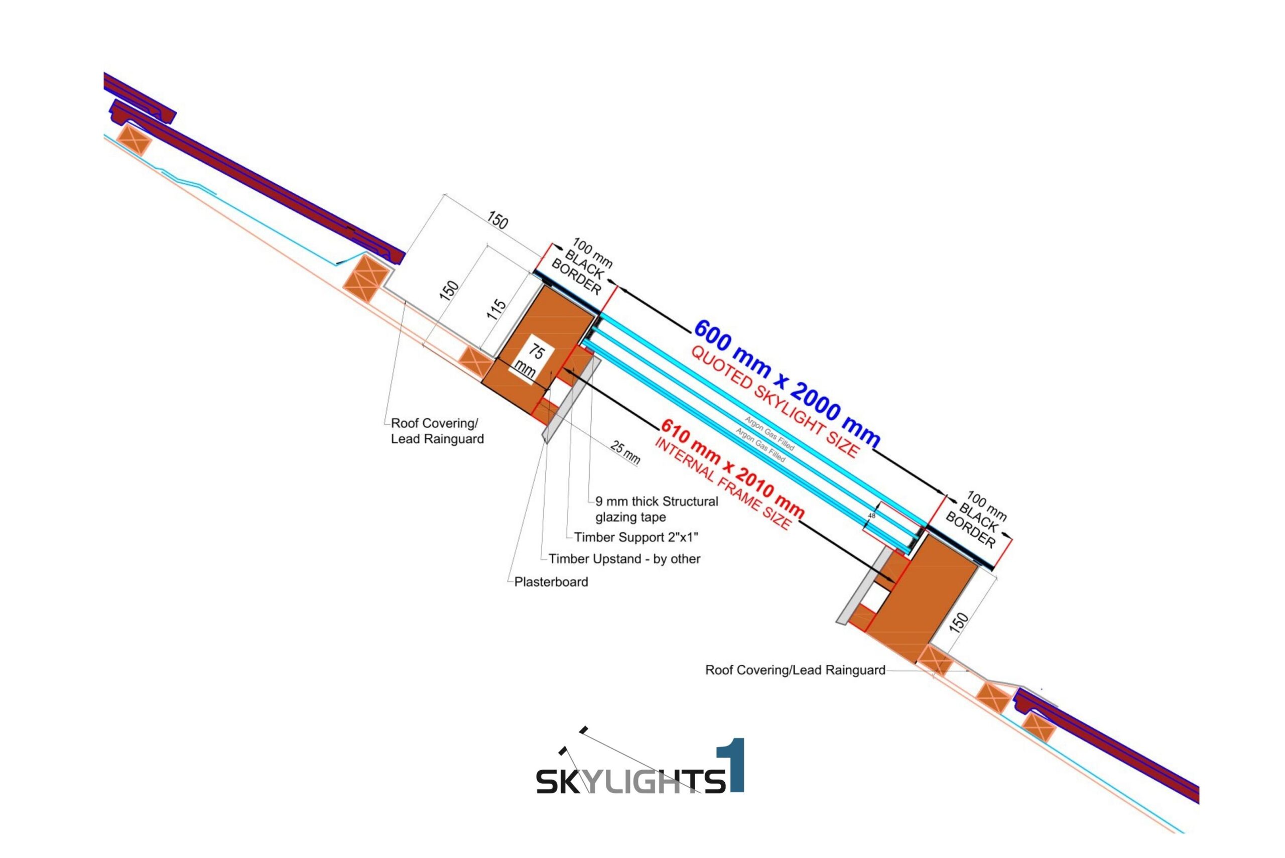 Detta högpresterande, ramfria takfönster utan öppning har tredubbla glas med 6 mm härdat, självrengörande glas och ett U-värde på endast 0,9 W/m²K. Den angivna interna glasstorleken är 60 x 200 cm, se konstruktionsdiagrammet nedan.