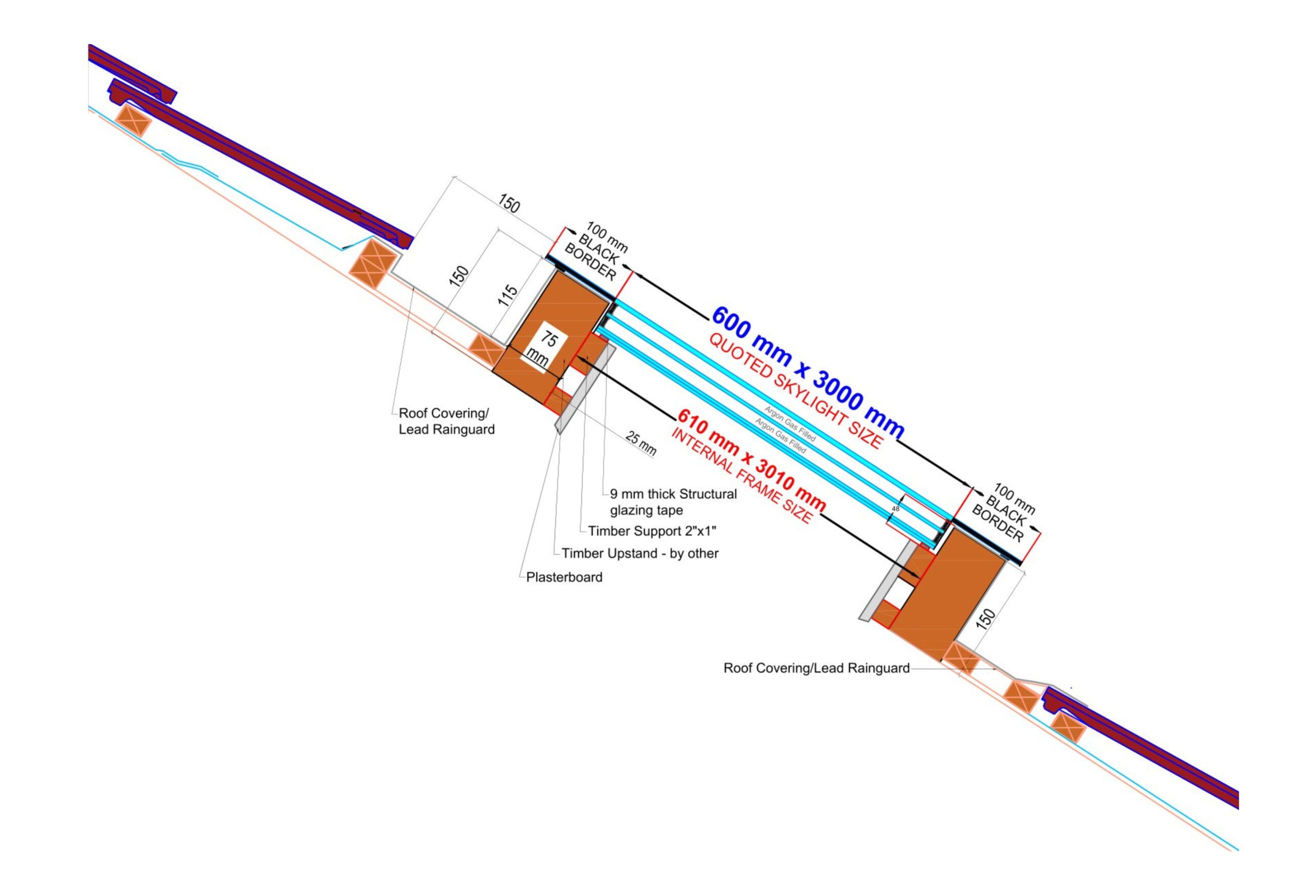 Detta högpresterande, ramfria takfönster utan öppning har tredubbelt glas med 6 mm härdat, självrengörande glas och ett U-värde på endast 0,9 W/m²K. Den angivna interna glasstorleken är 60 x 300 cm, se konstruktionsdiagrammet nedan.