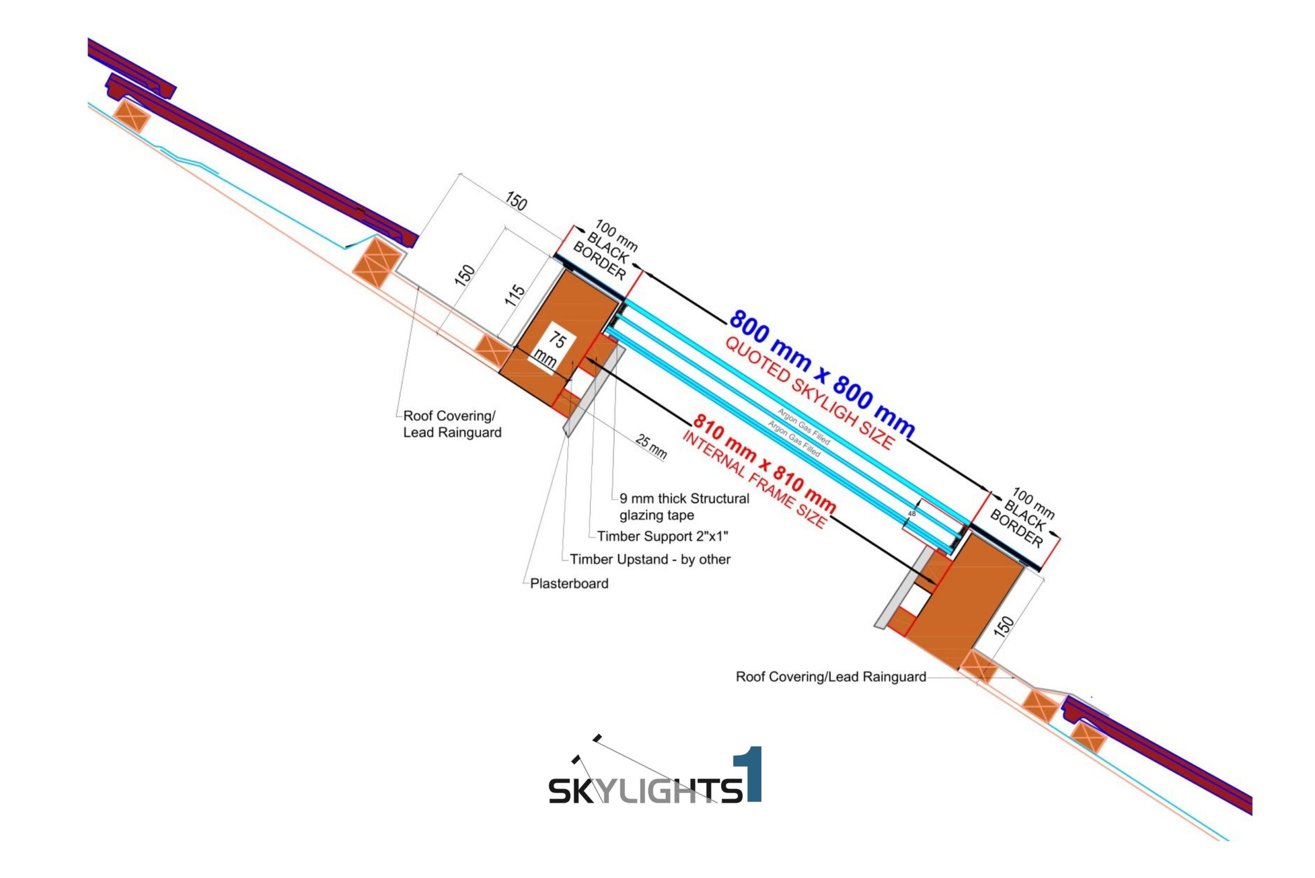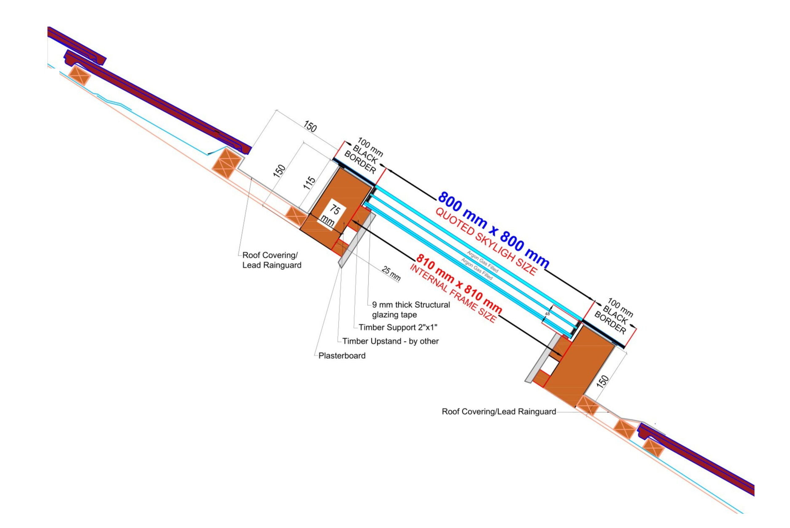 Detta högpresterande, ramfria takfönster utan öppning har treglasfönster med 6 mm härdat, självrengörande glas och ett U-värde på endast 0,9 W/m²K. Den angivna interna glasstorleken är 80 x 80 cm, se konstruktionsdiagrammet nedan.